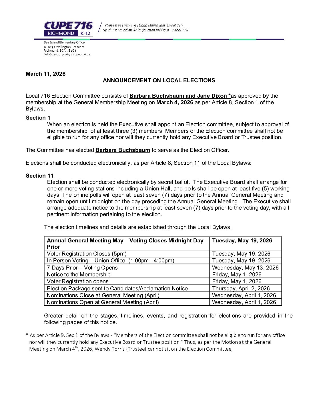 CUPE 716 Election Announcement
